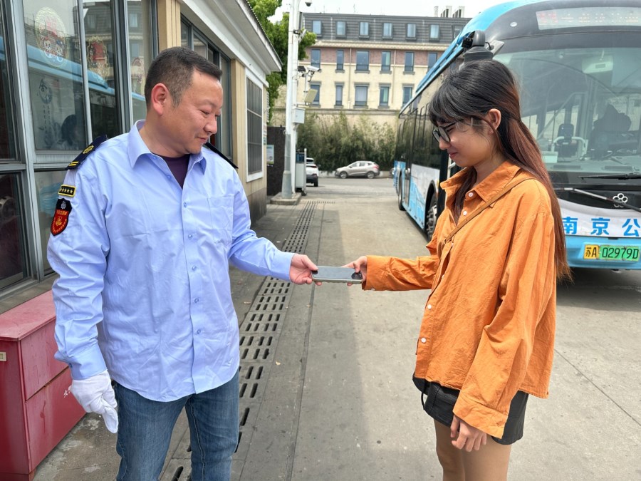 就在這時(shí),33路3931駕駛員崔小海駕駛車輛到達(dá)南京火車站,發(fā)現(xiàn)了車上有一個(gè)手機(jī)和一個(gè)包,立即拍照發(fā)到車隊(duì)群里,跟管理匯報(bào),避免乘客找來著急。車隊(duì)管理丁娟收到信息了,立即安撫這2位丟失東西的乘客,讓他們在辦公室安心等待駕駛員的到來。