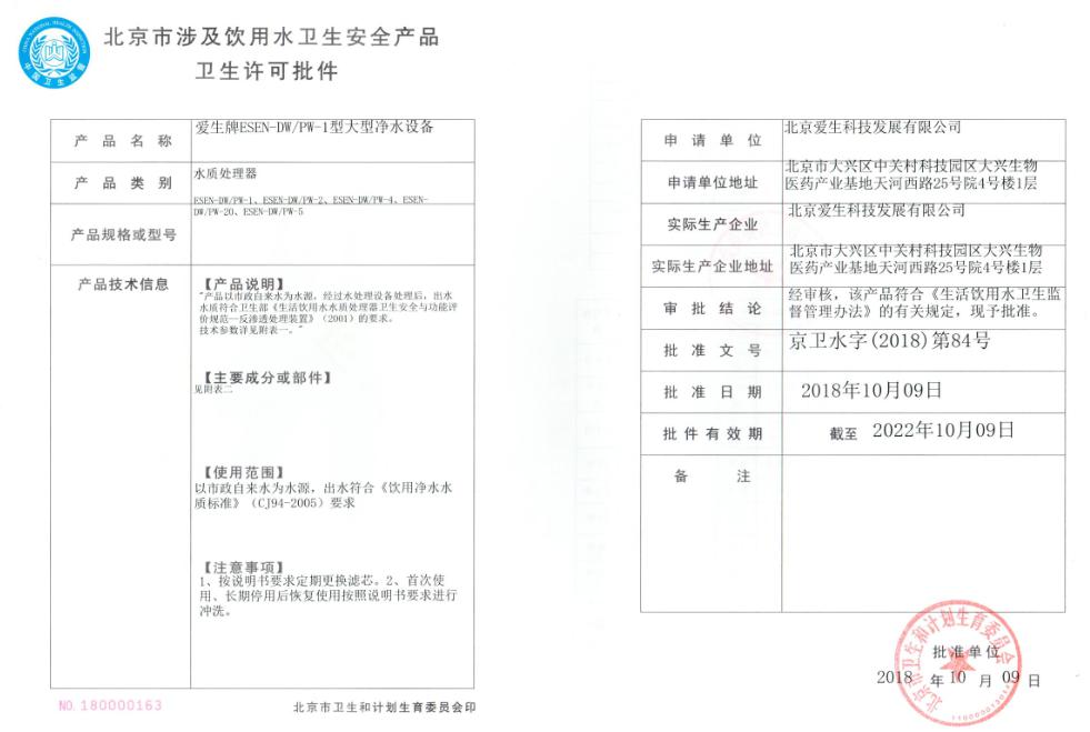 2018年8月底,愛生在長達十個月準備的新一期衛(wèi)生批件申請,一次通過北京疾控中心組織的專家上會評審,產品及能力均獲專家首肯;2018年11月,經北京市衛(wèi)生和計劃生育委員會批準,愛生拿到了第5張批件許可,成為北京地區(qū)為數不多的具備大型直飲水設備制造能力的專業(yè)企業(yè)。